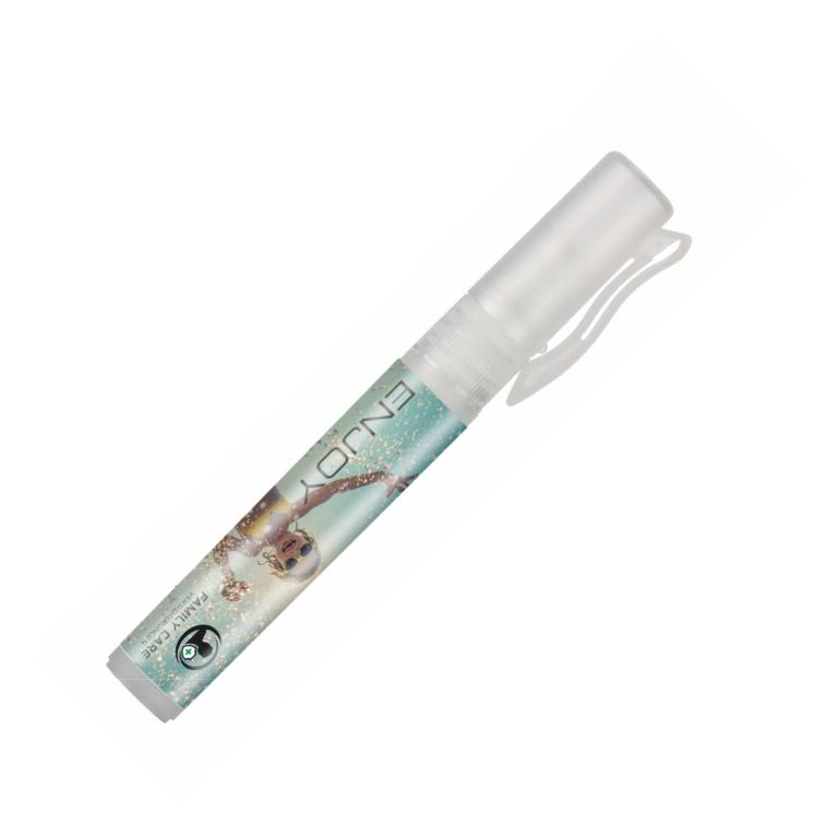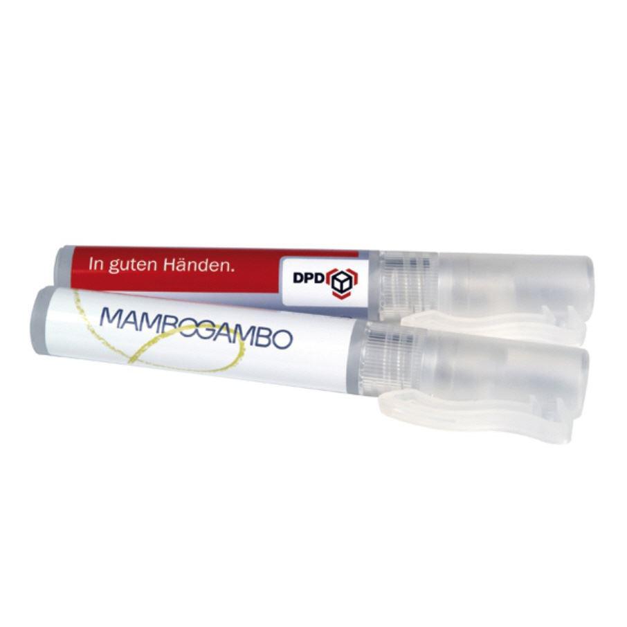 Pocket hand sanitising spray in frosted transparent stick with functional clip. With this spray you can wash your hands anytime and anywhere – without water, soap and towel. Ideal for those who travel a lot. The hands are clean, fresh and well cared for after use. The product does not stick. Use: Apply a few sprays into the palms of the hands and rub thoroughly in the hands and between the fingers. Cleanses thoroughly and has an antibacterial effect.