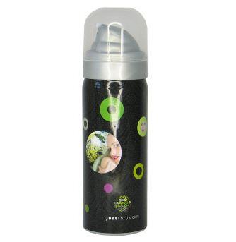 Aluminium can with a matt brushed finish, a silver coloured spray head and a transparent, round protective cap.