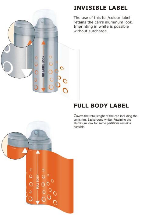- Full body label which covers the total lenght of the can including the conic rim. Background white. Having a aluminium look for some partitions remains possible.